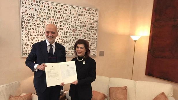 واضافت ان "نسخة أوراق الإعتماد تسلم حسب البروتوكول الرسمي لوزارة الخارجية الايطالية رئيس دائرة المراسم في الوزارة سعادة انيغو لامبرتيني".