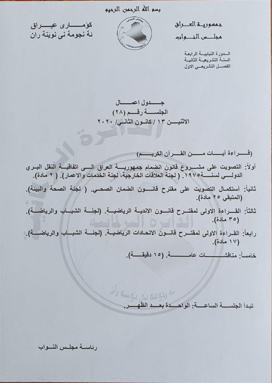 جدول أعمال جلسة مجلس النواب الاعتيادية ليوم غد الاثنين.