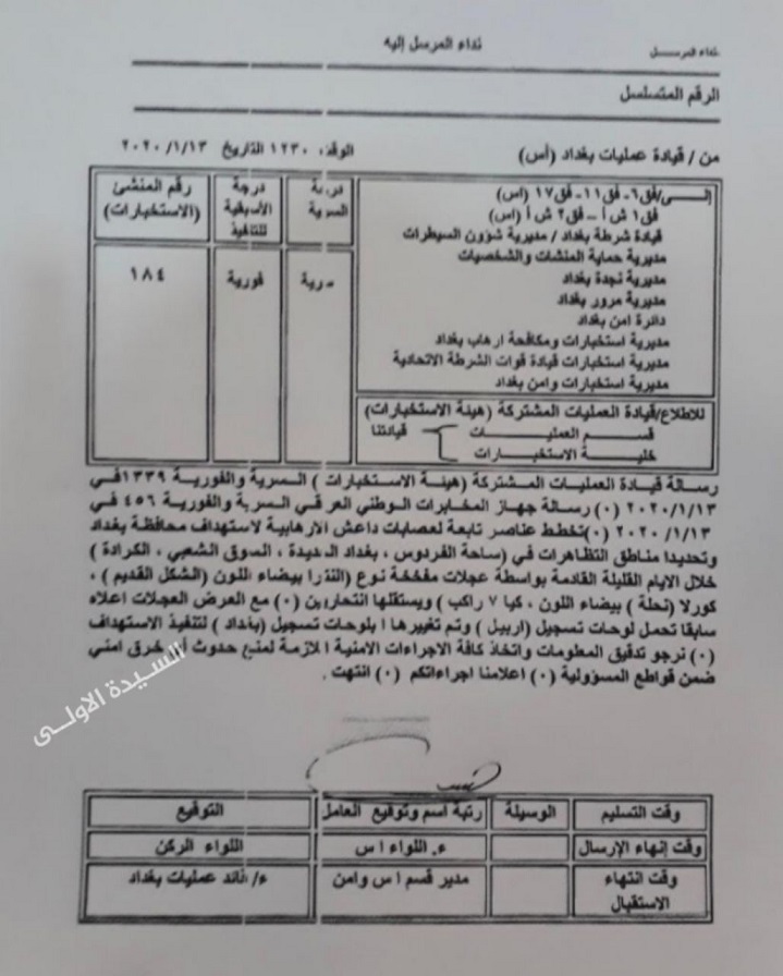 وجهت الاستخبارات العراقية تحذيرا للأجهزة الامنية مؤرخ في 13 يناير من مخطط لعصابات داعش بتنفيذ تفجيرات إرهابية في بغداد، وتحديدا بمناطق التظاهرات (ساحة الفردوس، بغداد الجديدة، السوق الشعبي، الكرادة).