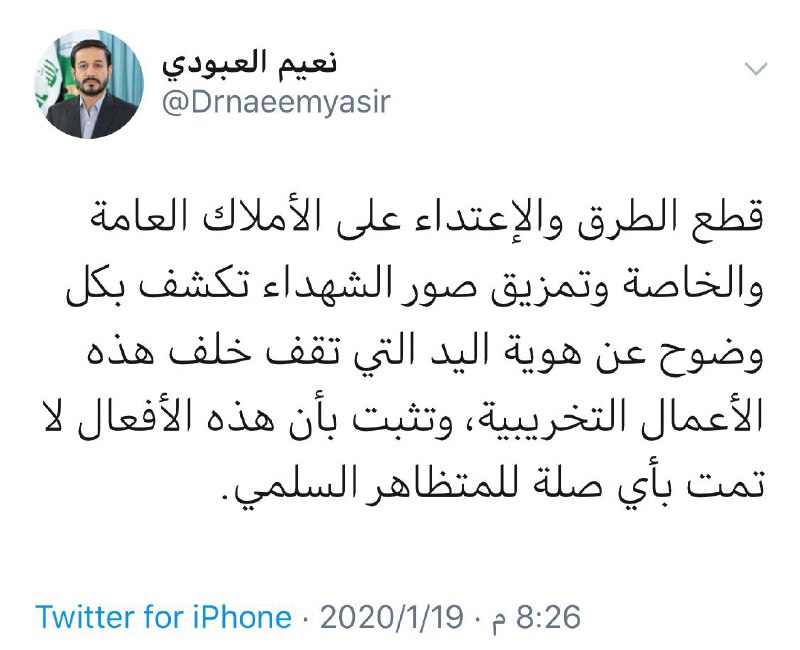 في تغريدة النائب عن صادقون نعيم العبودي يتحدث عن الجهات التي تقوم بالفوضى في العراق