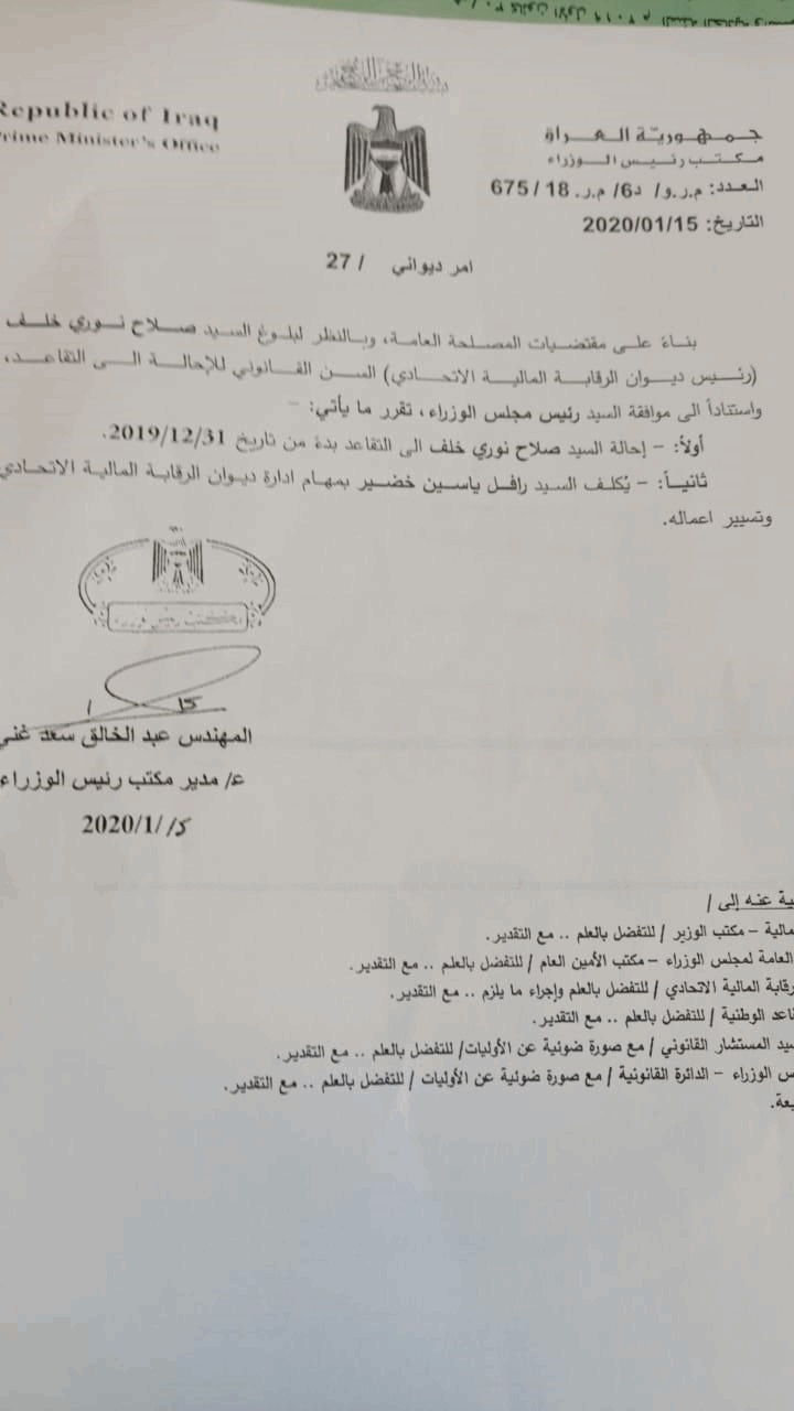 نشرت وثيقة تتضمن أمراً إدارياً يقضي بإحالة رئيس ديوان الرقابة المالية صلاح نوري خلف إلى التقاعد لبلوغه السن القانوني، وتكليف رافل ياسين خضير بمهام إدارة الديوان وتسيير أعماله.