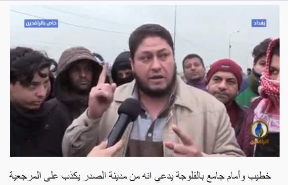 الشخص في هذا الفديو هو المدعو عبد القادر الانباري وهو من الانبار وامام جامع بالفلوجة اما ما يدعيه من انه من سكان مدينة الصدر فهو كذب جملة وتفصيلاً والحديث عن المرجعية بهذه الطريقة وتأكيد ما يقول بالقسم الحسيني المعروف محض افتراء