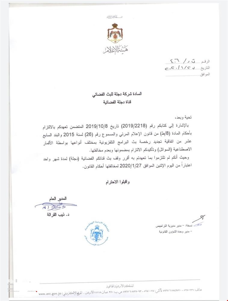وذكرت الوثيقة الموقعة من المدير العام للهيئة، ذيب القرالة: "بالإشارة إلى كتابكم المتضمن تعهدكم بالالتزام أحكام المادة (8/ط) من قانون الإعلام المرئي والمسموع رقم (26) لسنة 2015 و البند السابع عشر من اتفاقية تجديد رخصة بث البرامج التلفزيونية بمختلف أنواعها بواسطة الأقمار الاصطناعية (السوائل) و تأكيدكم الالتزام بمضمونها وبعدم مخالفتها، وحيث أنكم لم تلتزموا بما تعهدتم به، أقرر وقف بث قناتكم الفضائية (دجلة) لمدة شهر واحد اعتبارا من اليوم الاثنين، لمخالفتها أحكام القانون".