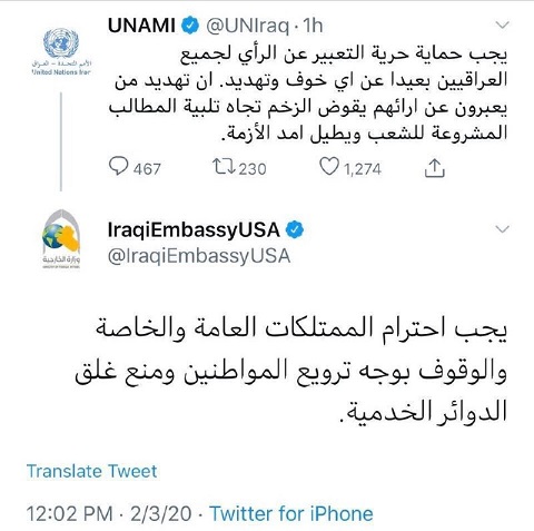 من جانبها، علقت السفارة العراقية في الولايات المتحدة الأميركية، اليوم، عبر حسابها في "تويتر" على تغريدة الامم المتحدة بالقول "يجب احترام الممتلكات العامة والخاصة والوقوف بوجه ترويع المواطنين ومنع غلق الدوائر الخدمية".