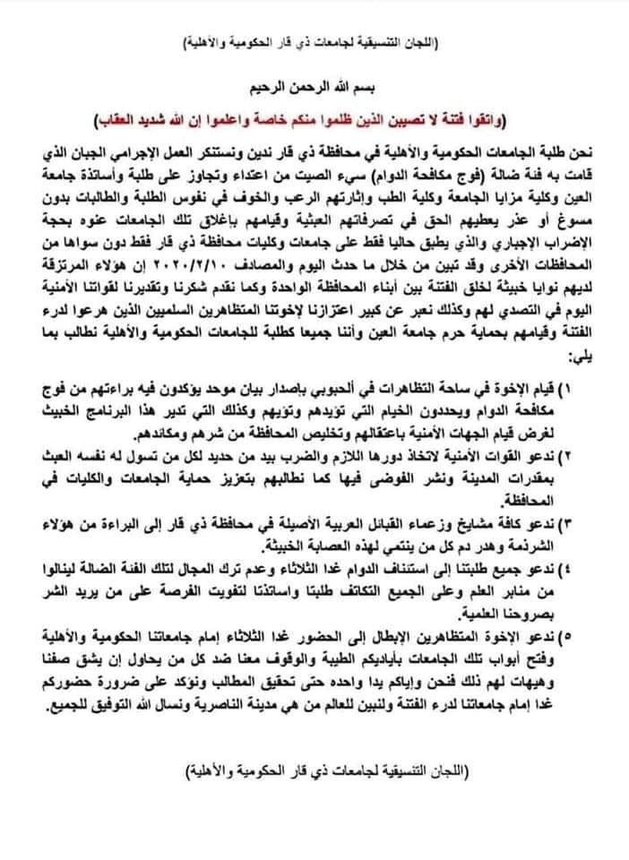 السلام عليكم . لقد ورد في البيان أعلاه خطأً لغويّاً وهو ( طلبتا واساتذتا ) والاصح هو ( طلبةً و أساتذةً ) . شكراً لكم .