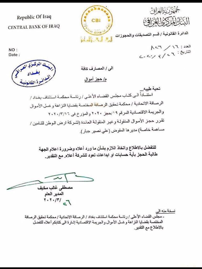 نشرت وثيقة صادرة من البنك المركزي العراقي تتضمن حجز الاموال المنقولة وغير المنقولة العائدة لشركة ارض الوطن للتأمين مديرها المفوض علي نصير جبار.