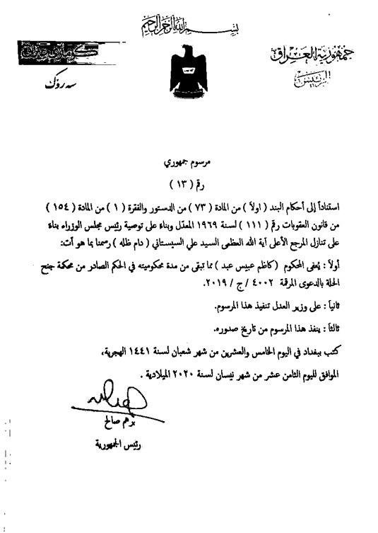 اصدر رئيس الجمهورية برهم صالح، عفوا خاصا على محكوم اساء الى المرجع الديني الاعلى الامام المفدى السيد علي السيستاني في وقت سابق.