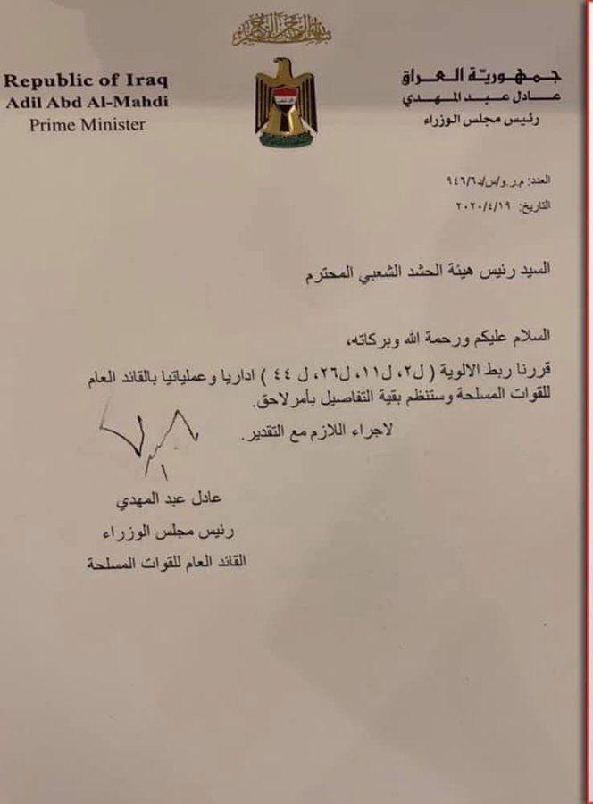 عبد المهدي يربط اربعة الوية بالحشد الشعبي بمكتب القائد العام للقوات المسلحة