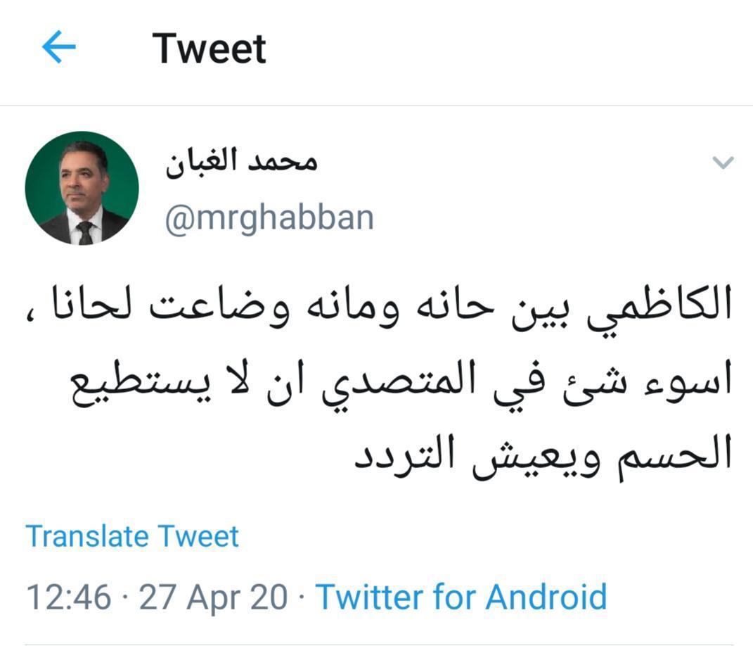 وقال الغبان في تغريدة على صفحته بموقع (تويتر)، إن "الكاظمي بين حانة ومانة وضاعت لحانا، أسوأ شيء في المتصدي أن لا يستطيع الحسم ويعيش التردد".