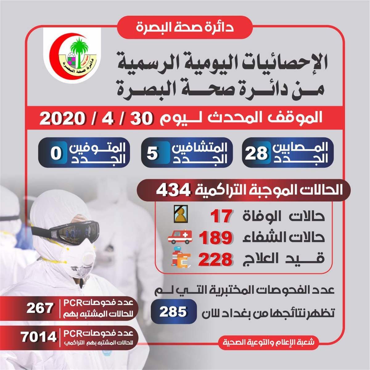 أعلنت دائرة صحة البصرة، الخميس، تسجيل 28 إصابة جديدة بفايروس كورونا وخمس حالات شفاء، اليوم.