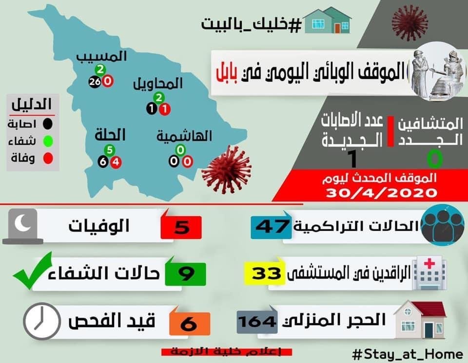 سجلت محافظة بابل، إصابة واحدة جديدة بفايروس كورونا، اليوم الخميس، ليرتفع إجمالي الإصابات المسجلة بالمحافظة إلى 47 بينها 9 حالاء شفاء.