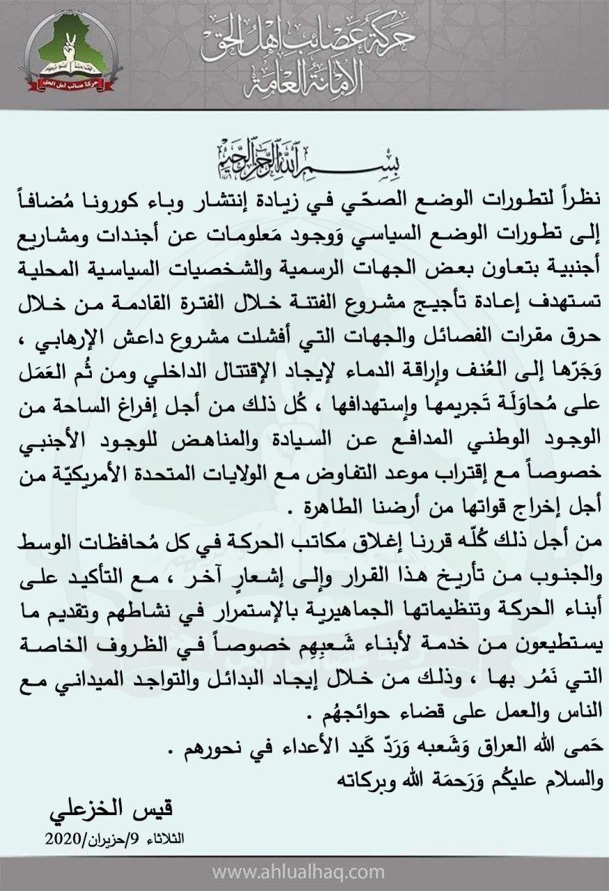 قرر الأمين العام لعصائب أهل الحق الشيخ قيس الخزعلي، الثلاثاء، إغلاق مقرات الحركة في مناطق الوسط والجنوب، فيما أكد أن ذلك جاء نظراً لتطورات الوضع الأوضاع الصحية والسياسية ووجود معلومات عن أجندات ومشاريع أجنبية تستهدف إعادة تأجيج مشروع الفتنة.