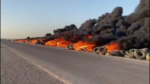 وعادة ما يستخدم المحتجون الاطارات القديمة في قطع الطرق كتعبير للاحتجاجات التي بدأت في تشرين الاول الماضي 2019 .