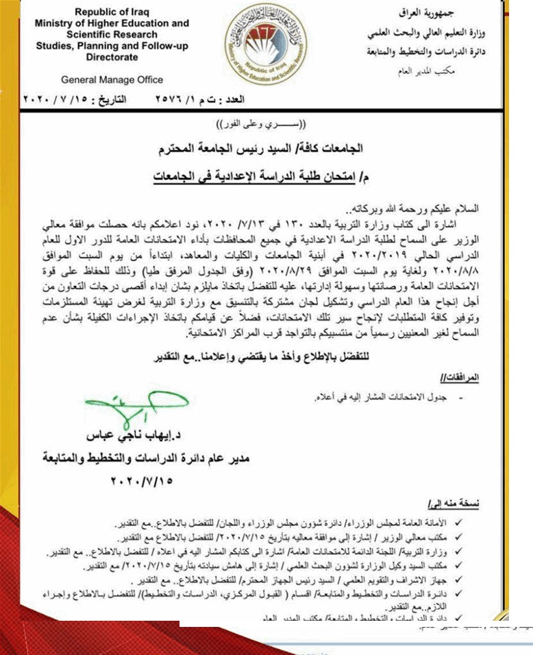 جدير بالذكر أن الامتحانات النهائية للدراسة الإعدادية ستبدأ يوم السبت الموافق 8/8/2020 وتستمر لغاية يوم السبت الموافق 29/8/2020.