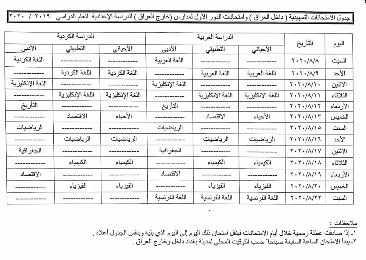 وقالت الوزارة في بيان انه "تم نشر الجدول الخاص بالامتحانات التمهيدية للطلبة الخارجيين (داخل العراق) للدراسة الاعدادية بفروعها (الاحيائي ، التطبيقي ،الادبي) وللدراستين العربية والكردية بالاضافة الى امتحانات الدور الاول لمدارس خارج العراق".