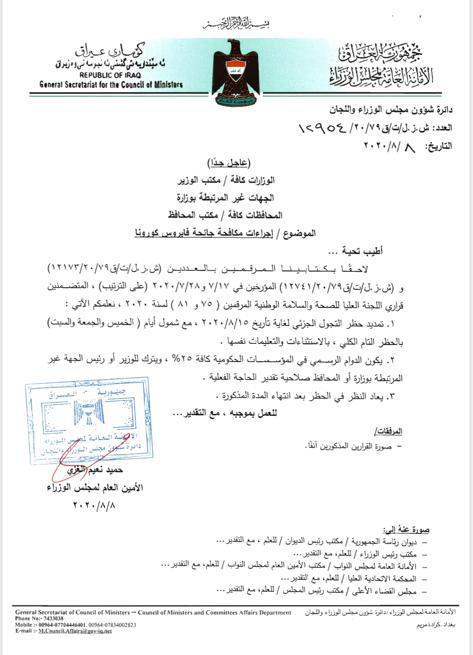 وجاء في وثيقة للامانة ، إنه "تقرر تمديد حظر التجوال الجزئي لغاية 15 من الشهر الجاري وشمول أيام الخميس والجمعة والسبت بالحظر التام".