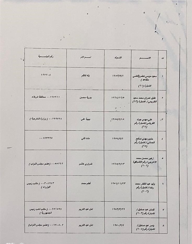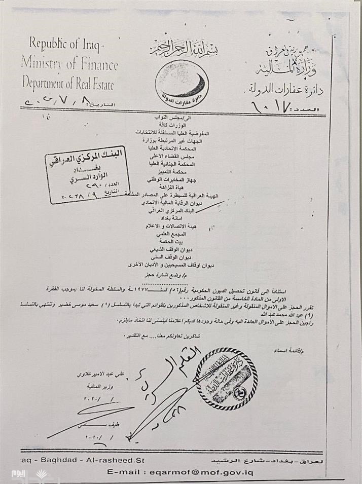 ونص الكتاب الذي عممه المركزي إلى المصارف المجازة كافة على طلب لحجز الاموال المنقولة وغير المنقولة لـ 9 شخصيات، بينهم النائب ياسر عبد صخيل واخيه لقمان ومحافظ كربلاء السابق عقيل الطريحي وزهير الاعرجي عضو مجلس النواب السابق .