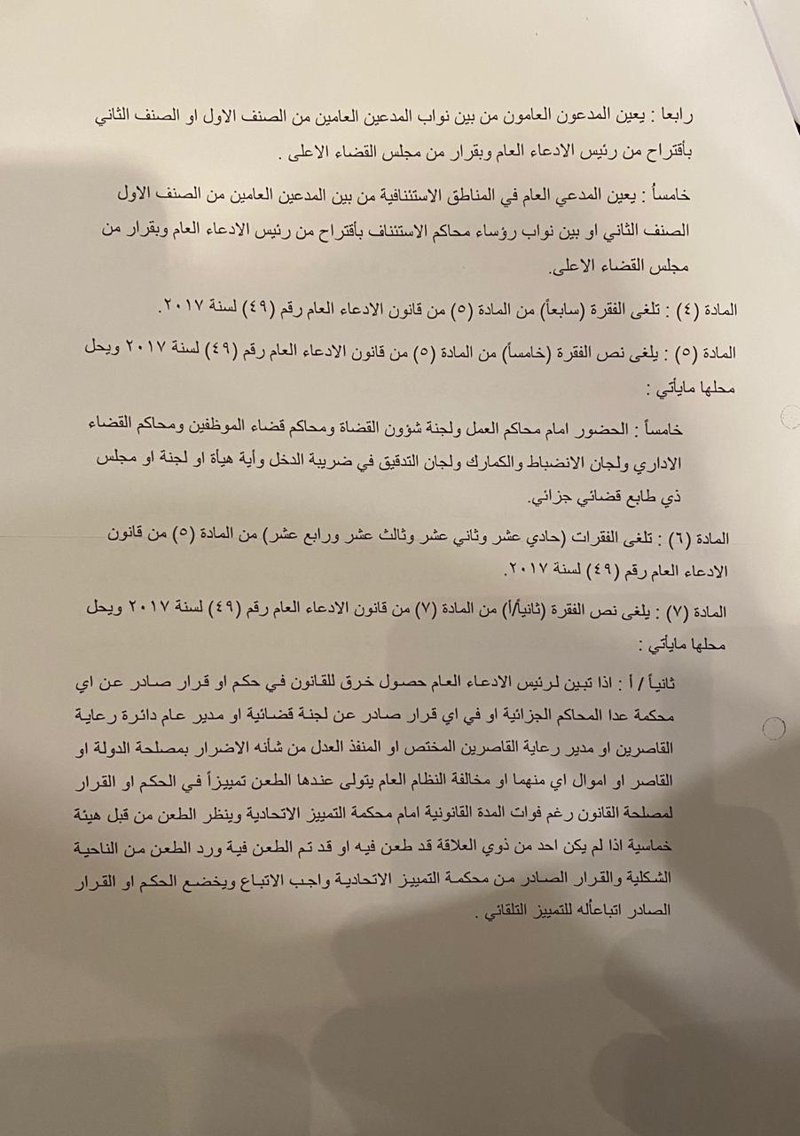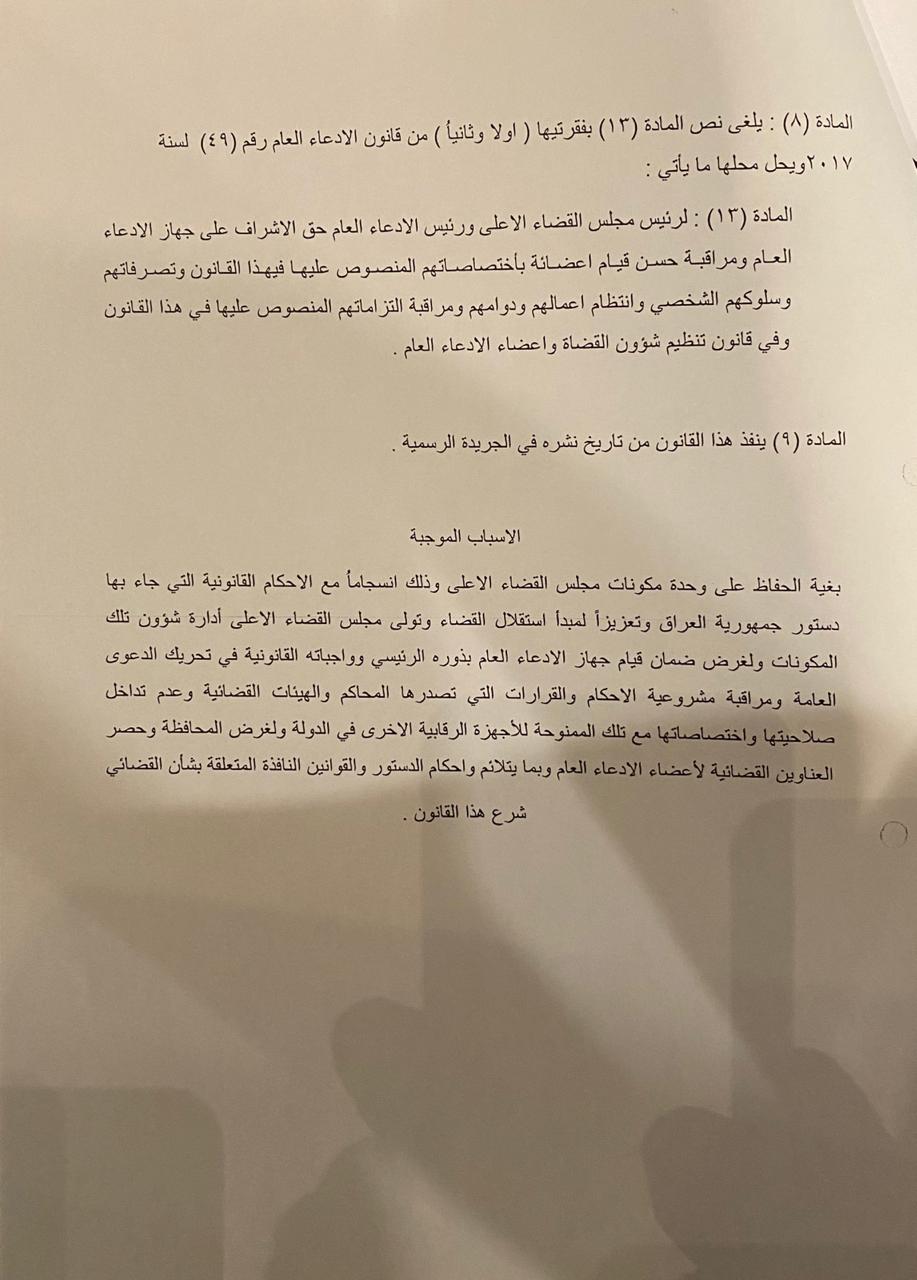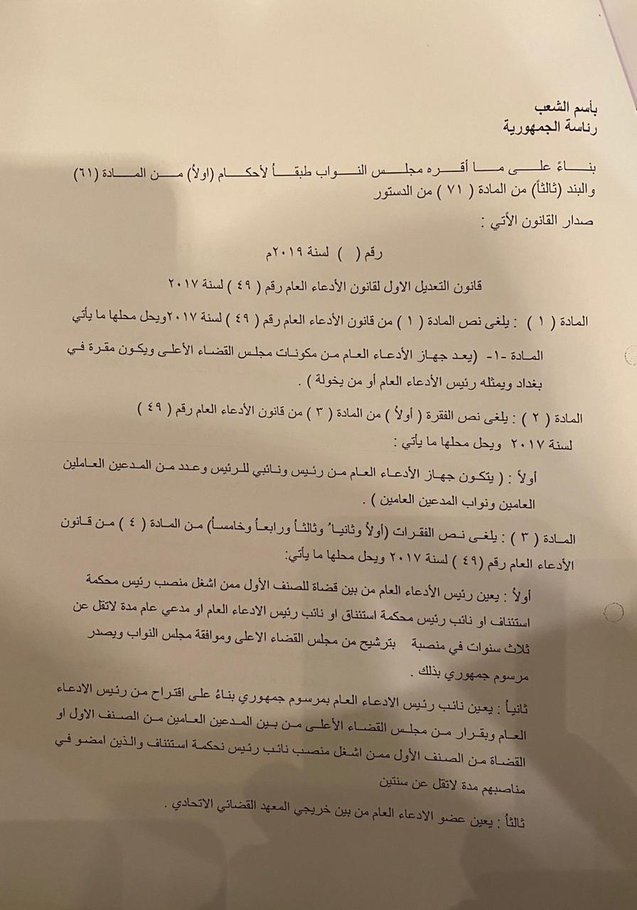 نص مقترح قانون التعديل الاول لقانون الادعاء العام رقم ٤٩ لسنة ٢٠١٧.