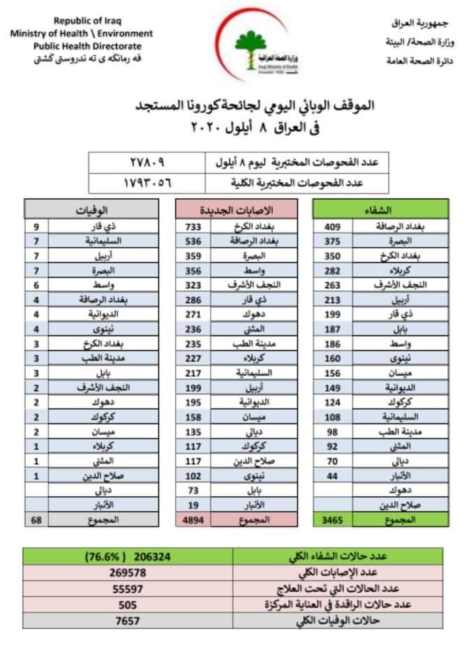 وأضافت أن " مجموع الإصابات الكلي بلغ 269578، وحالات الشفاء الكلي 206324 حالة، أما مجموع الوفيات الكلي فقد بلغ 7657 حالة".