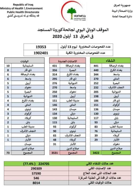 وسجل العراق اليوم الاحد، 3531 اصابة جديدة بكورونا و3422 حالة شفاء.