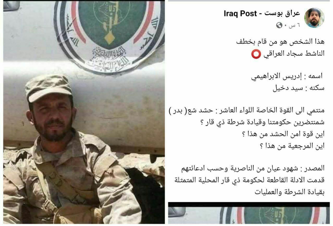 حيث قاموا بنشر صورة الشهيد على الفيسبوك واسمه ابو علي الابراهيمي المنسوب الى بدر المجاهدة والذي استشهد عام 2018 وقالوا انه قام باختطاف احد الناشطين ويدعى سجاد العراقي حيث اقاموا الدنيا ولم يقعدوها عليه الى درجة ان رئيس الوزراء المدعو مصطفى الكاظمي يقوم بارسال قوة من جهاز مكافحة الارهاب الى ذي قار للبحث عنه
