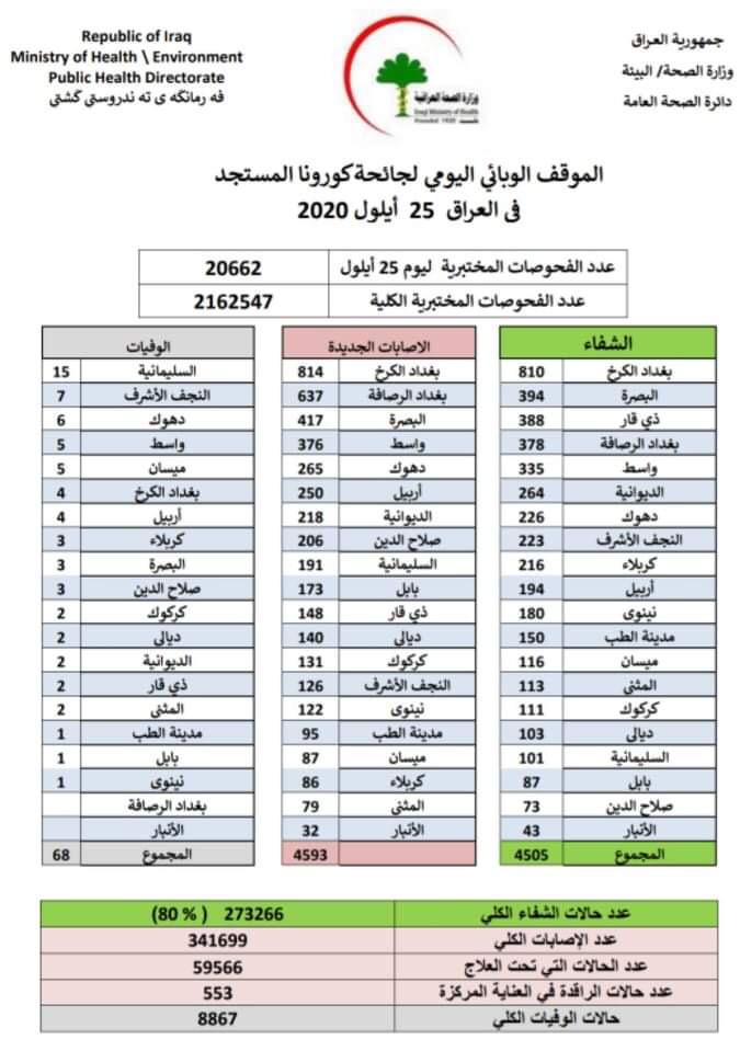 أعلنت وزارة الصحة والبيئة، الجمعة، عن تسجيل 4593 إصابة جديدة بفيروس كورونا، وفيما أشارت إلى تماثل 4505 حالات للشفاء من الوباء، أكدت تسجيل 68 حالة وفاة جديدة.