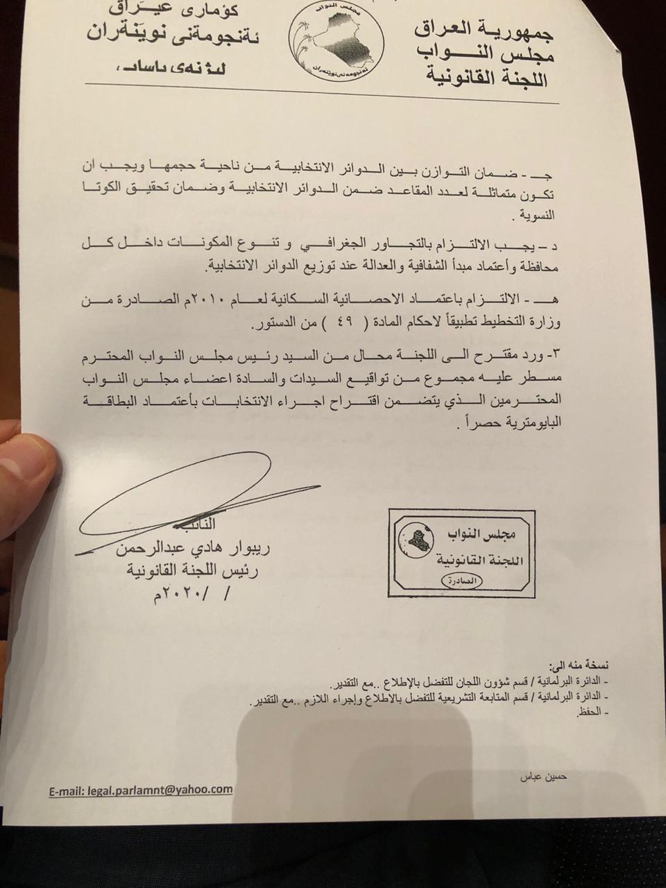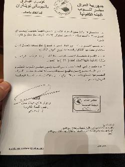 وجاء في تقرير اللجنة، ان "مقترحاً محالاً من رئيس مجلس النواب محمد الحلبوسي مسطر عليه مجموعة من تواقيع اعضاء مجلس النواب ورد الى اللجنة".
