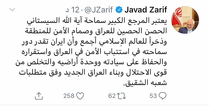 وقال ظريف في تغريدة على موقعه في "تويتر"، إن "المرجع الكبير سماحة آية الله السيستاني يعتبر الحصن الحصين للعراق وصمام الأمن للمنطقة وذخراً للعالم الاِسلامي أجمع".