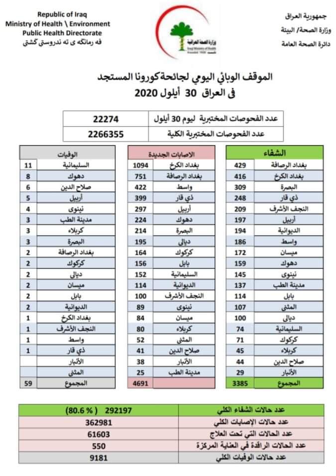 اعلنت وزارة الصحة، الاربعاء، عن الموقف الوبائي اليومي بشأن كورونا في عموم العراق.