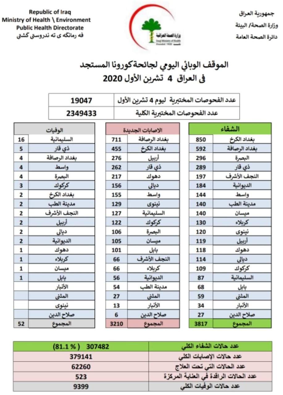 وذكرت الوزارة في بيان، انه "تم تسجيل ٣٨١٧ حالة شفاء و٥٢ حالة وفاة".