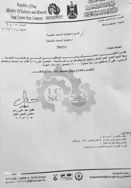 وكانت وثيقة تداولتها مواقع التواصل الاجتماعي صادرة عن الشركة العامة للسمنت العراقية التابعة لوزارة الصناعة، تتضمن قراراً يتيح لموظفيها الحصول على مادة السمنت، بدل الرواتب التي تأخرت على الموظفين.