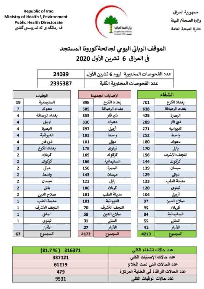وجاء في بيان الموقف الوبائي في العراق، خلال 24 ساعة الماضية، انه "تم تسجيل 67 وفاةً و4172 اصابة و 4213 حالة شفاء جديدة بفيروس كورونا، في عموم مناطق البلاد".
