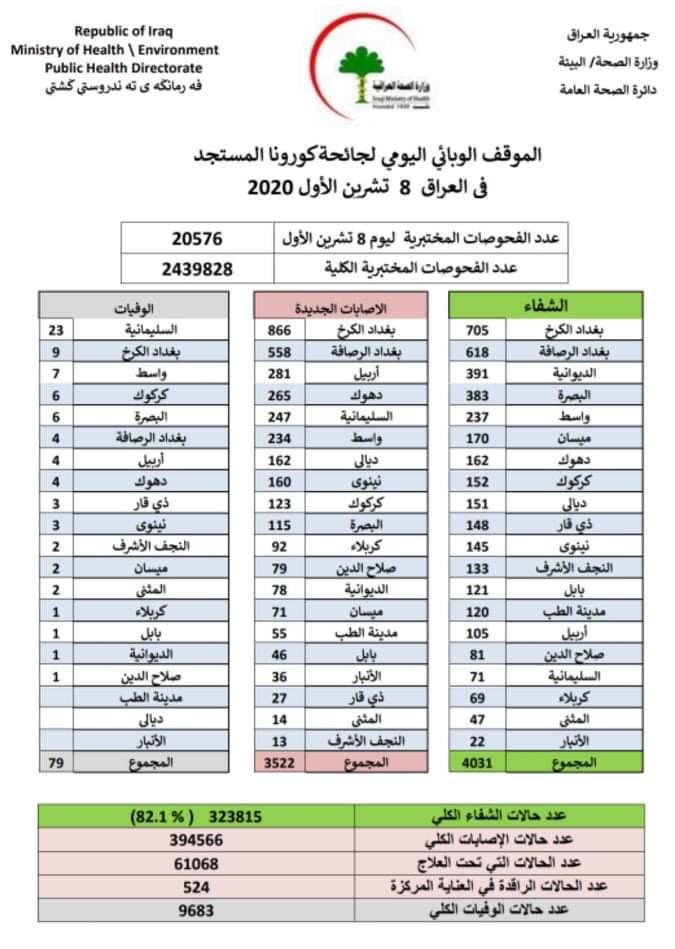أعلنت وزارة الصحة، الخميس، عن تسجل 3522 إصابة جديدة بفيروس كورونا و79 حالة وفاة، مشيرة إلى تماثل 4031 مصاباً بالفيروس للشفاء.
