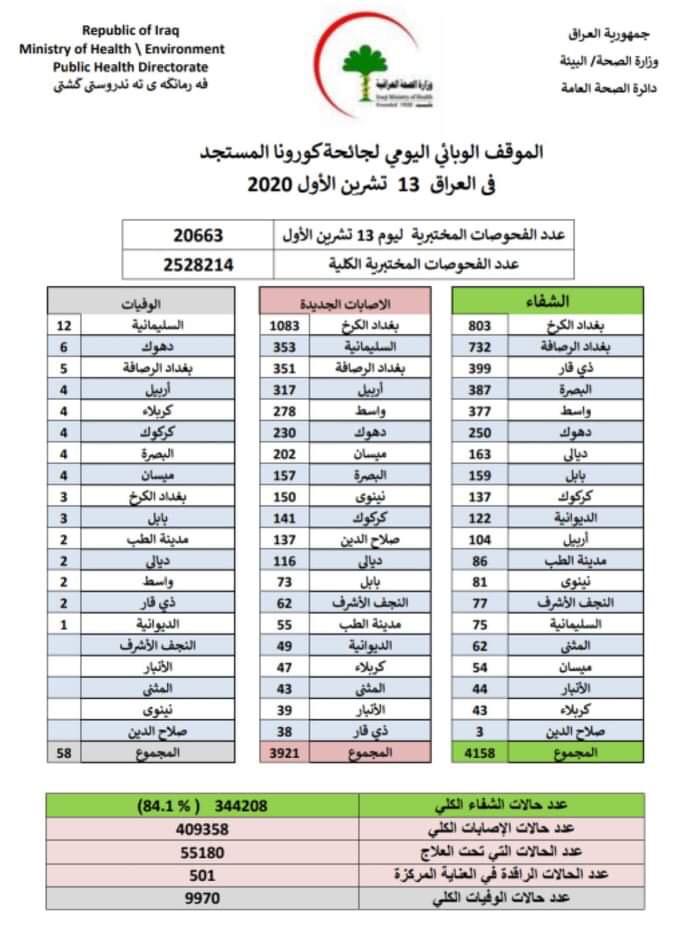 اعلنت وزارة الصحة، الثلاثاء، عن الموقف الوبائي اليومي لجائحة كورونا في العراق لليوم، فيما اظهر الموقف ان حالات الشفاء من الفايروس اعلى من الاصابات.