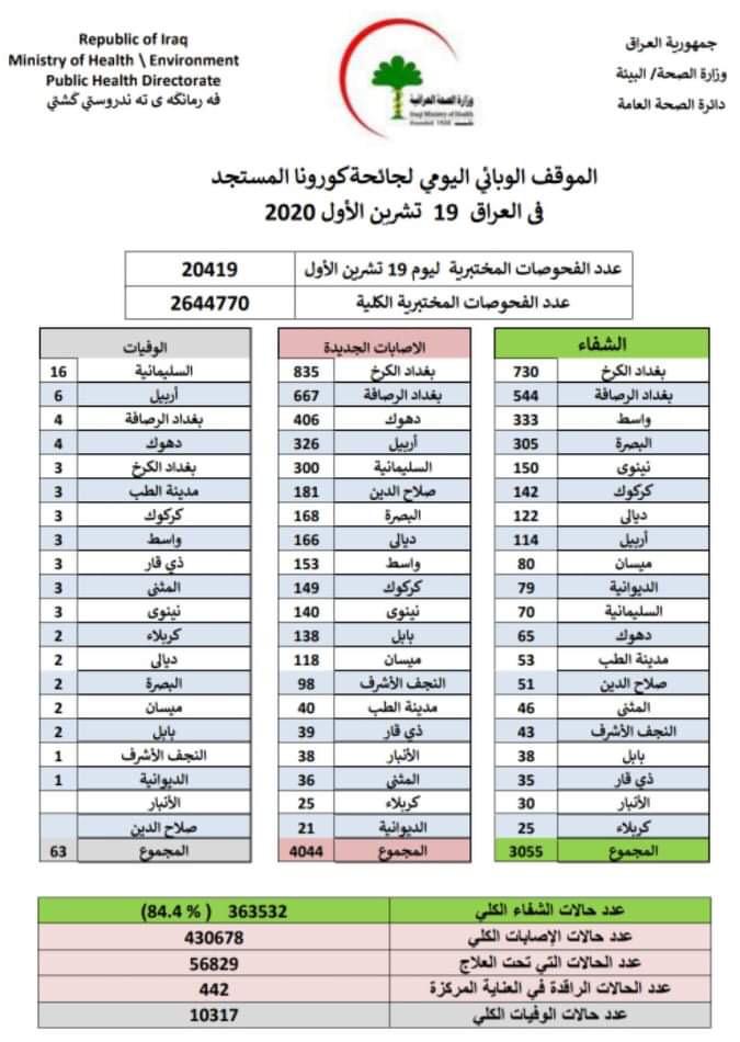اعلنت وزارة الصحة والبيئة، عن الموقف الوبائي اليومي لفيروس كورونا فيما اشارت الى تسجيل 4044 اصابة جديدة بالفيروس وتعافي 3055 شخا ووفاة 63 آخرين.