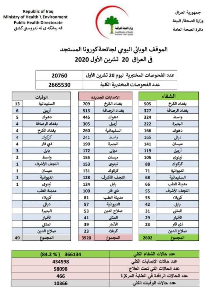 اعلنت وزارة الصحة، الثلاثاء، عن الموقف الوبائي اليومي لجائحة كورونا في العراق لليوم .