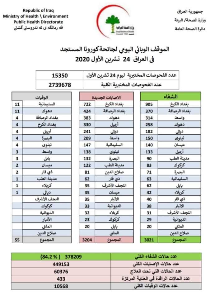 اعلنت وزارة الصحة، السبت، عن الموقف الوبائي اليومي لجائحة كورونا في العراق لليوم.