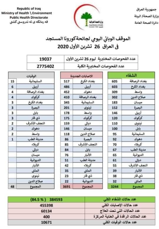 اعلنت وزارة الصحة، الاثنين، عن الموقف الوبائي لكورونا في العراق لليوم.