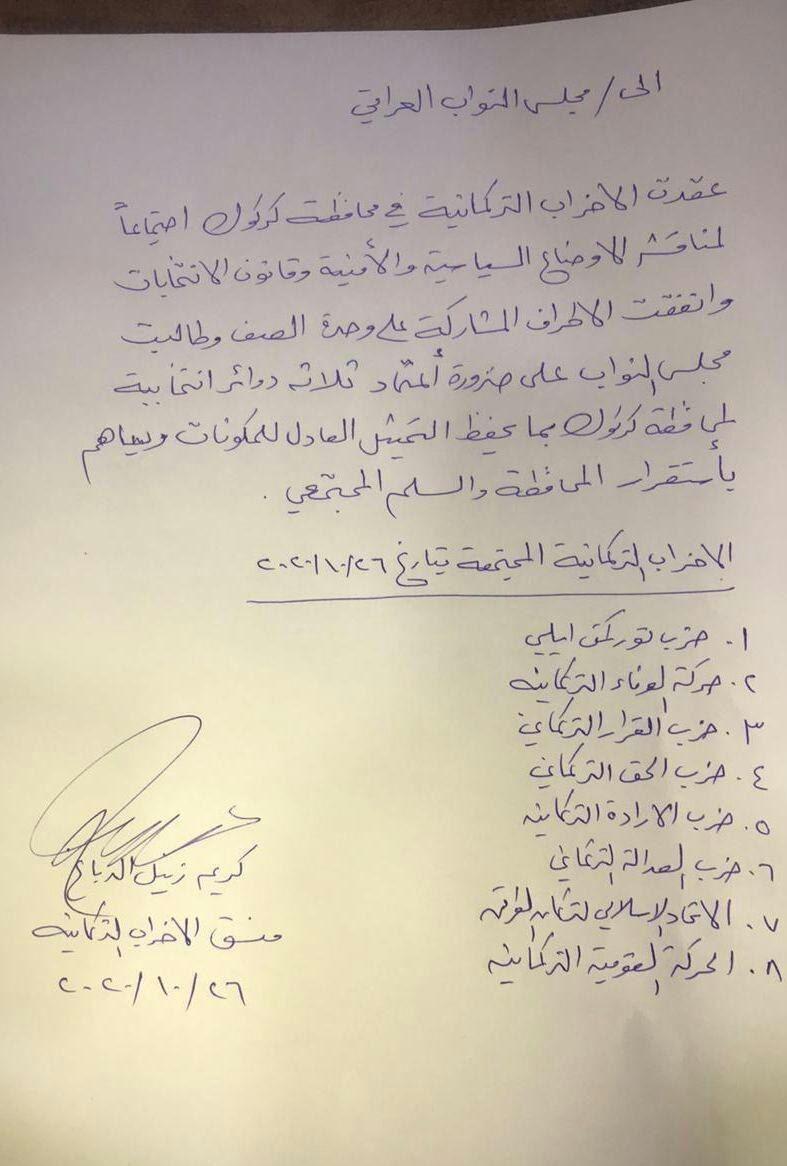 بالوثيقة .. الاحزاب التركمانية تخاطب البرلمان لجعل كركوك ثلاث دوائر انتخابية