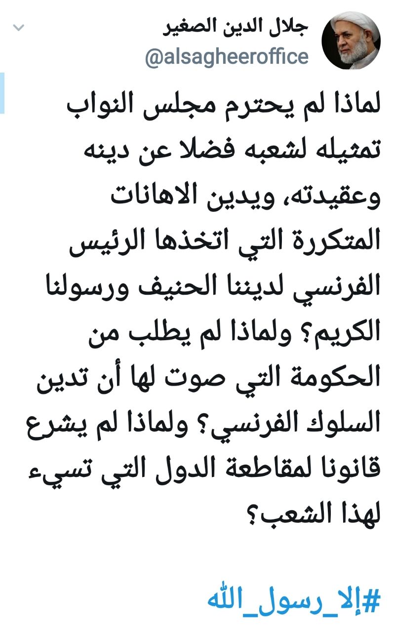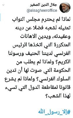 وقال بتغريدة على حسابه في تويتر لماذا لم يحترم مجلس النواب تمثيله لشعبه فضلا عن دينه وعقيدته، ويدين الاهانات المتكررة التي اتخذها الرئيس الفرنسي لديننا الحنيف ورسولنا الكريم؟