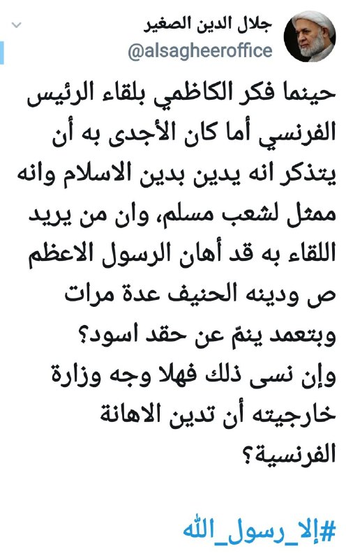 وفي تغريدة ثانية وجهها لرئيس الوزراء مصطفى الكاظمي حينما فكر الكاظمي بلقاء الرئيس الفرنسي أما كان الأجدى به أن يتذكر انه يدين بدين الاسلام وانه ممثل لشعب مسلم، وان من يريد اللقاء به قد أهان الرسول الاعظم ص ودينه الحنيف عدة مرات وبتعمد ينمّ عن حقد اسود؟