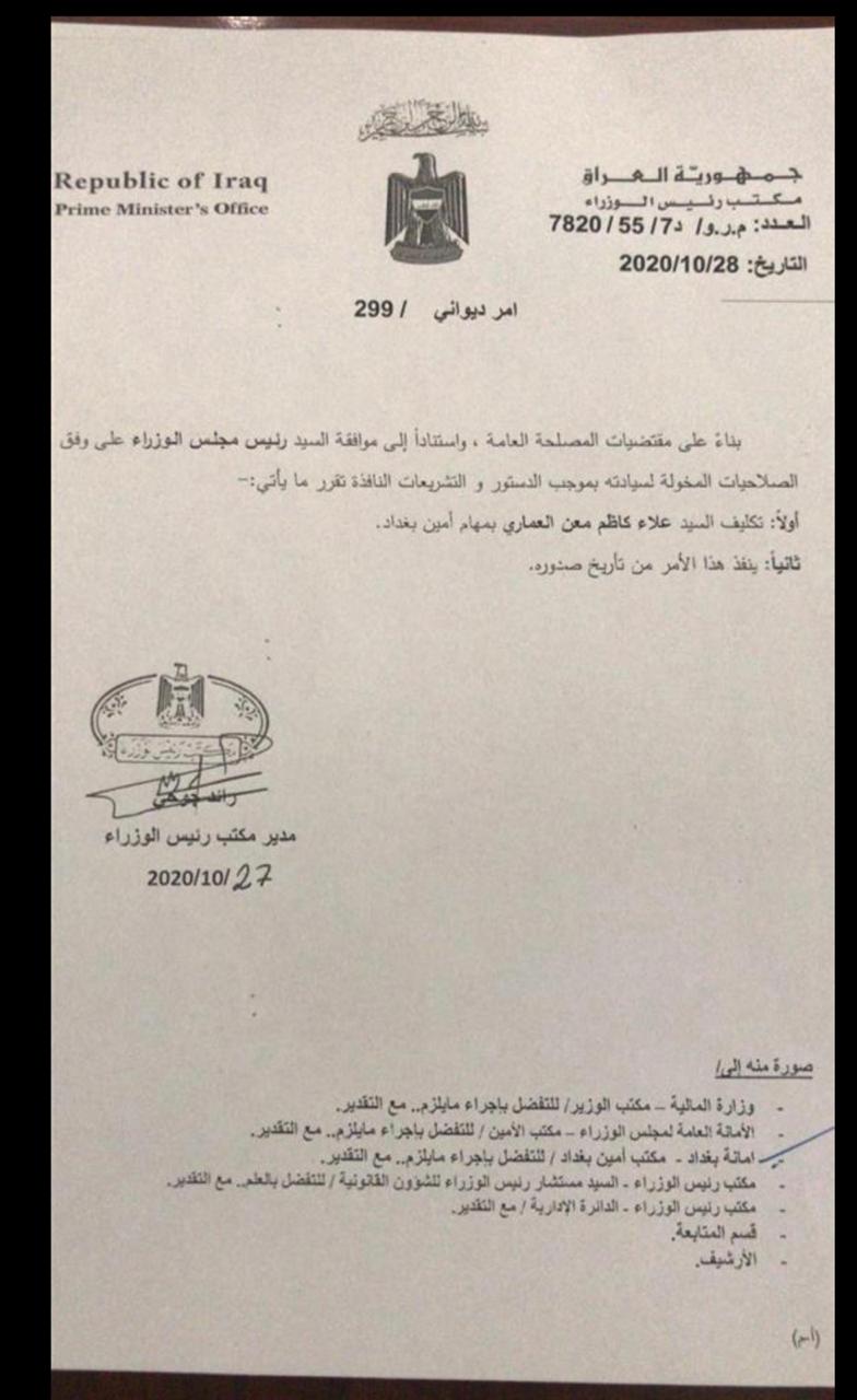 تم تعيين علاء معن امينا لبغداد خلفا للامين السابق منهل الحبوبي الذي استقال بسبب حالته الصحية