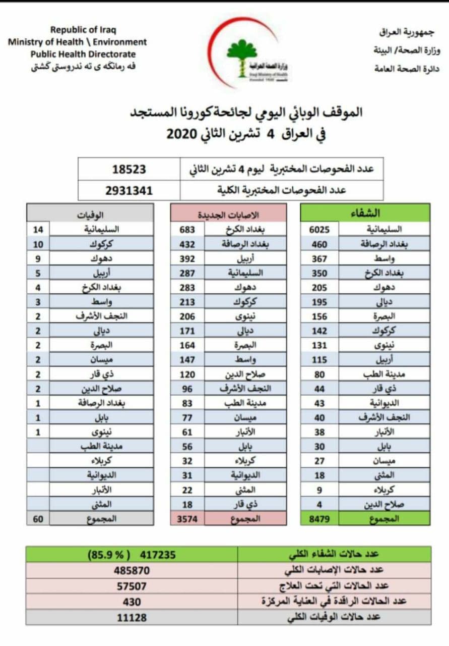 كما سجلت 60 حالة وفاة بكورونا في عموم العراق
