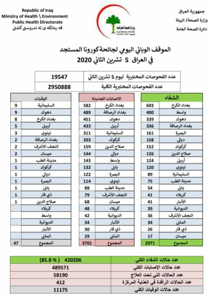 كما اعلنت الوزارة في بيان لها، تماثل 2971 مصاباً بفيروس كورونا للشفاء وتسجيل 47 حالة وفاة جديدة بكورونا.
