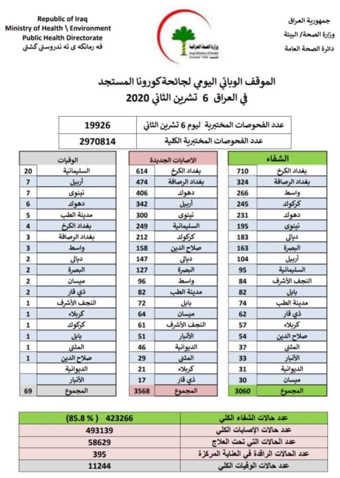 أعلنت وزارة الصحة، عن الموقف الوبائي لفيروس كورونا، اليوم الجمعة، فيما أشارت الى تسجيل 3568 إصابة جديدة بالفيروس و69 حالة وفاة، فيما أكدت تماثل 3060 حالة للشفاء.