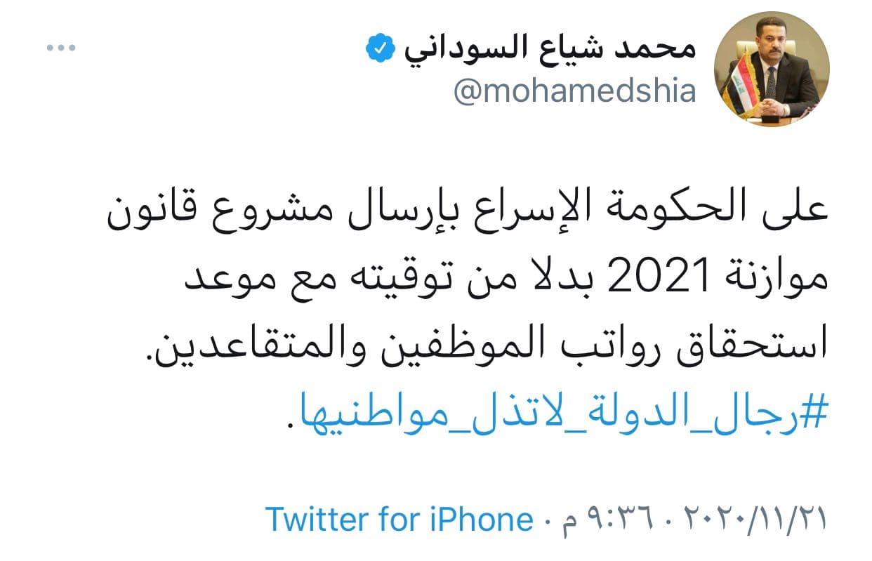 السوداني يطالب الحكومة بارسال الموازنة وعدم مزامنتها مع توزيع الرواتب