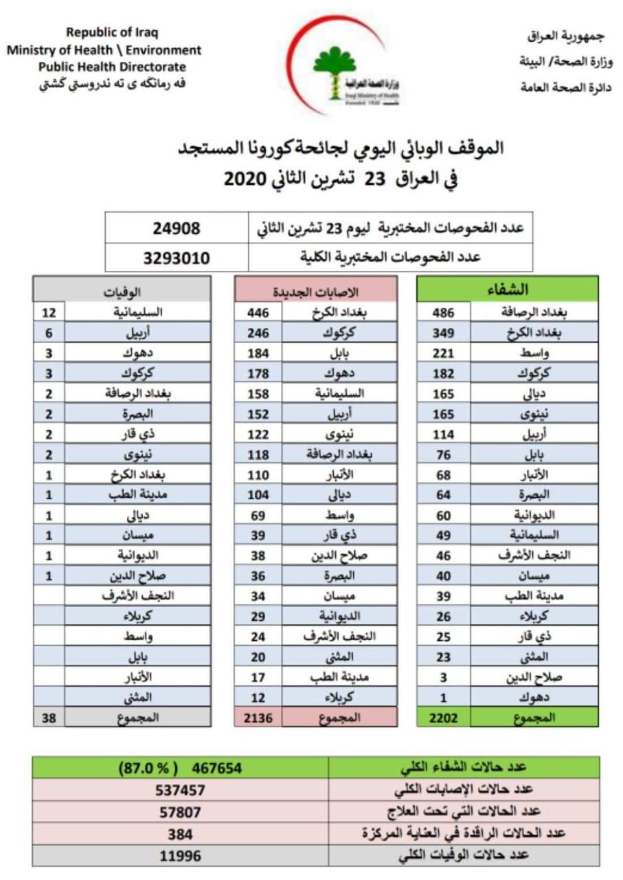 وتوفي 38 حالة بكورونا في العراق خلال 24 ساعة