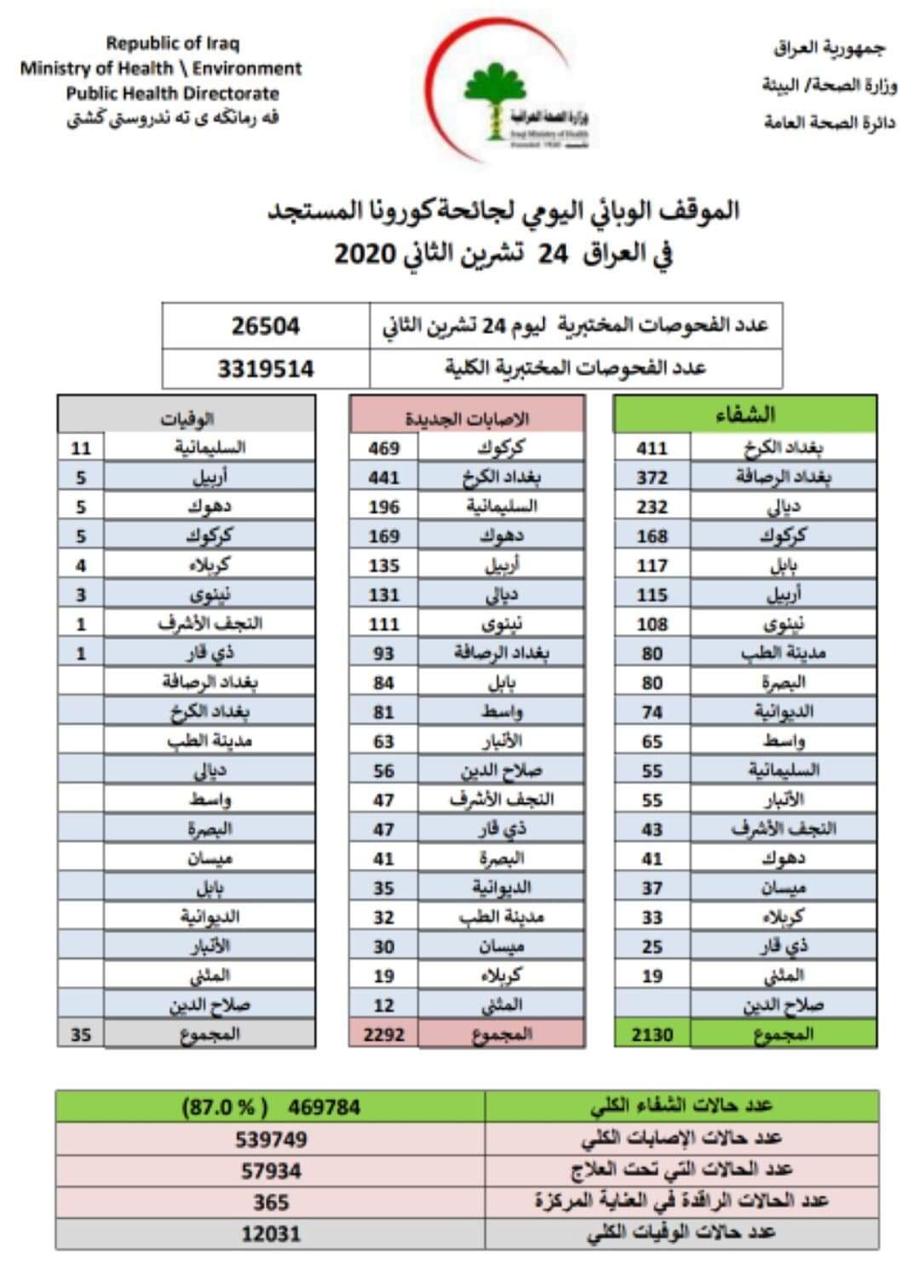 اعلنت وزارة الصحة، الثلاثاء، عن الموقف الوبائي اليومي لجائحة كورونا في العراق لليوم.