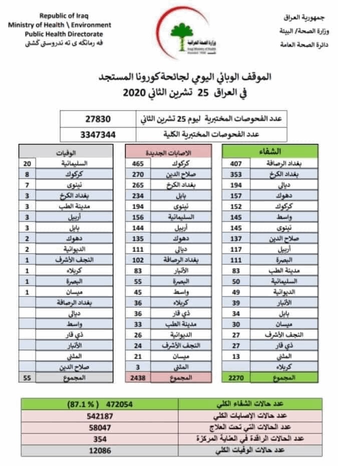 أعلنت وزارة الصحة، الأربعاء، تسجيل 2438 إصابة جديدة بفايروس كورونا، ورصد 2270 حالة شفاء، ووفاة 55 مصاباً في خلال 24 ساعة في عموم العراق.
