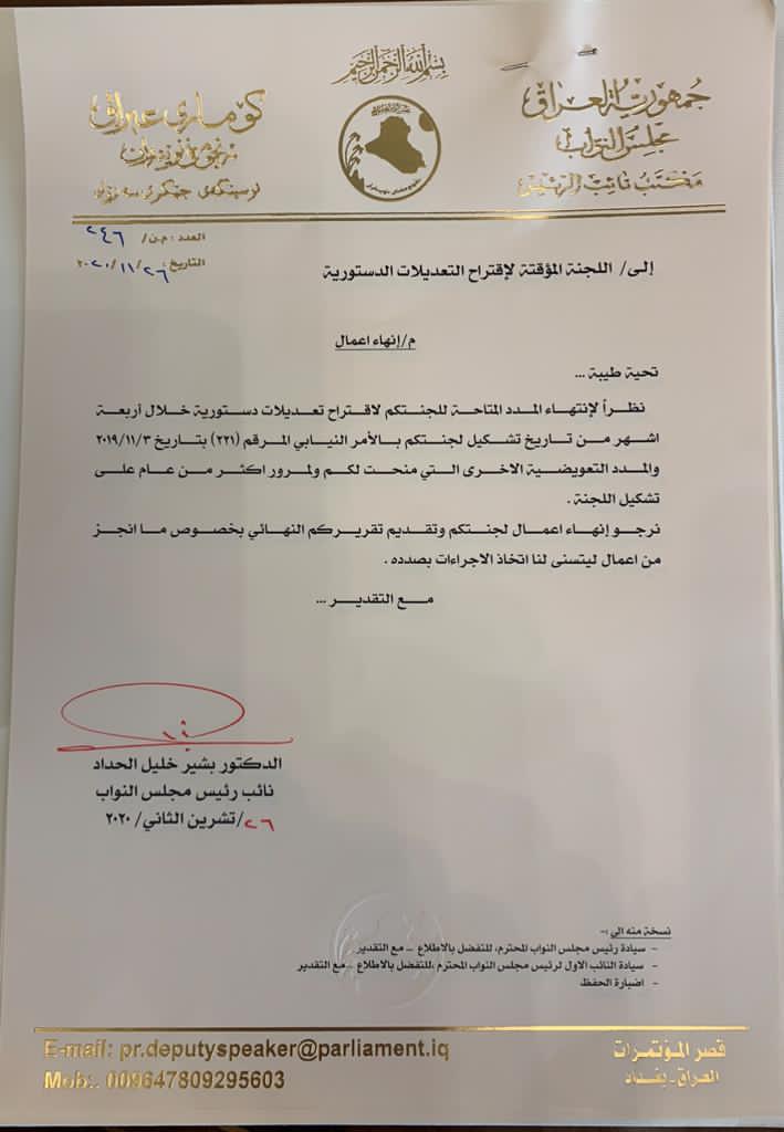 وجه نائب رئيس مجلس النواب العراقي بشير خليل الحداد، الخميس، بخطاب رسمي اللجنة المؤقتة لإقتراح التعديلات الدستورية إنهاء أعمال اللجنة.